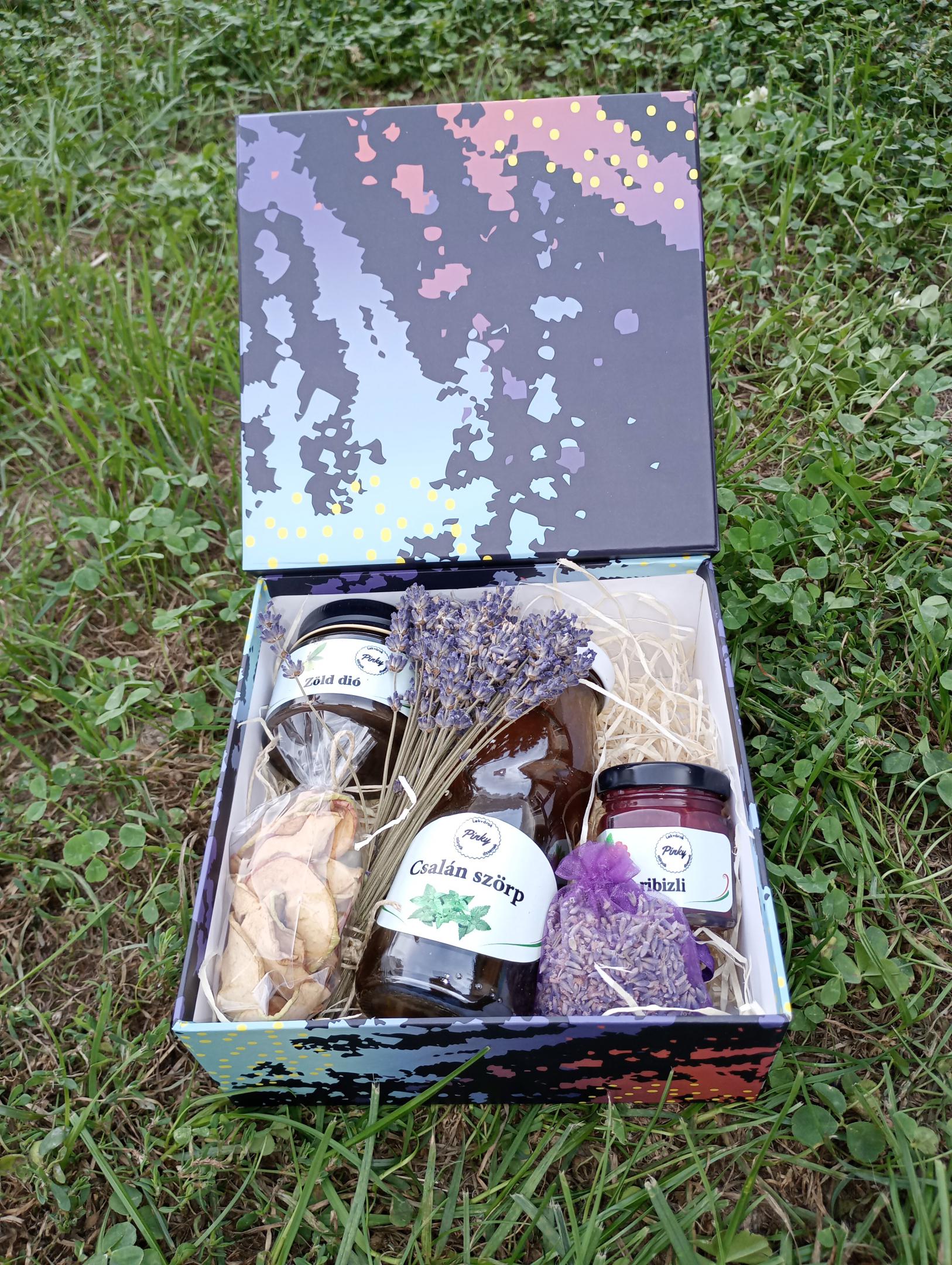 Összetétel: Csalán szörp, alma chips, levendula zsák, zöld dió lekvár, levendula csokor, piros ribizli dzsem