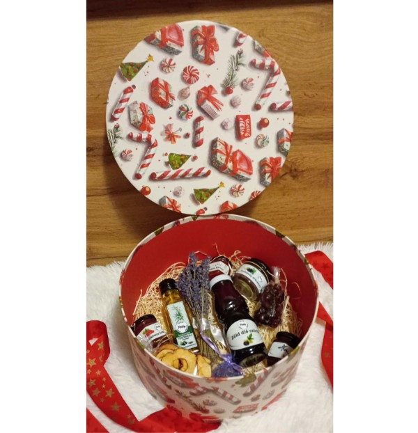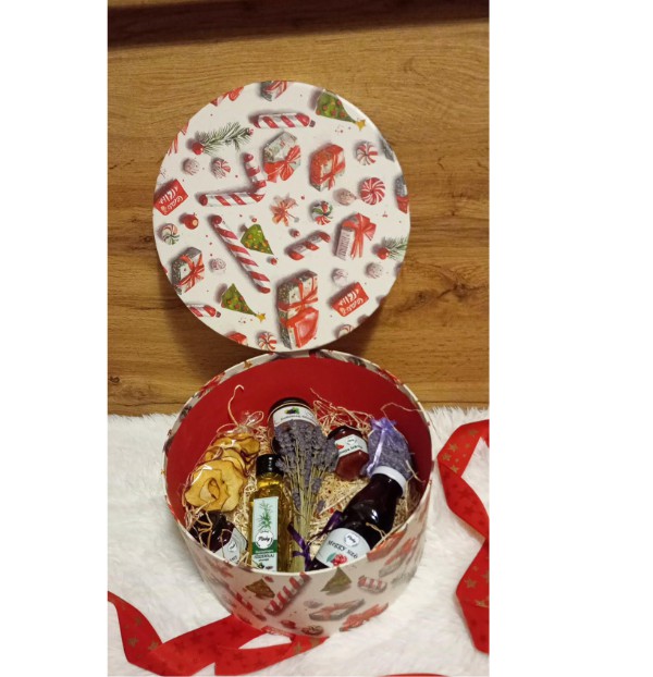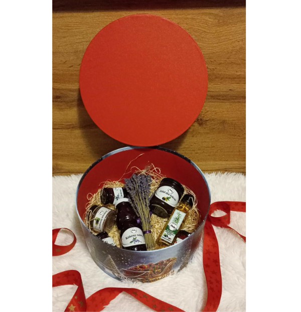 Összetétel: Csalán szörp, alma chips, levendula zsák, zöld dió lekvár, levendula csokor, piros ribizli dzsem