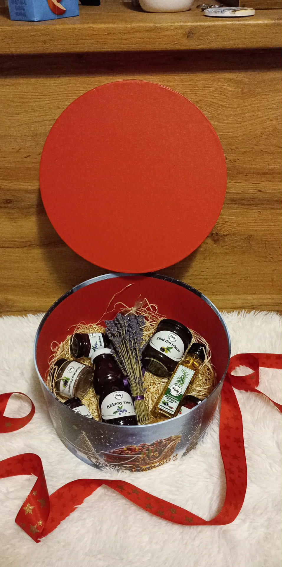 Összetétel: kökény szörp, zöld dió lekvár, levendula csokor, alma chips, szőlőmag őrlemény, csipkebogyó lekvár, birsalma othelló szőlővel lekvár, kökény lekvár rozmaringos fűszerolaj extra szűz olivaoljjal, levendula zsák,