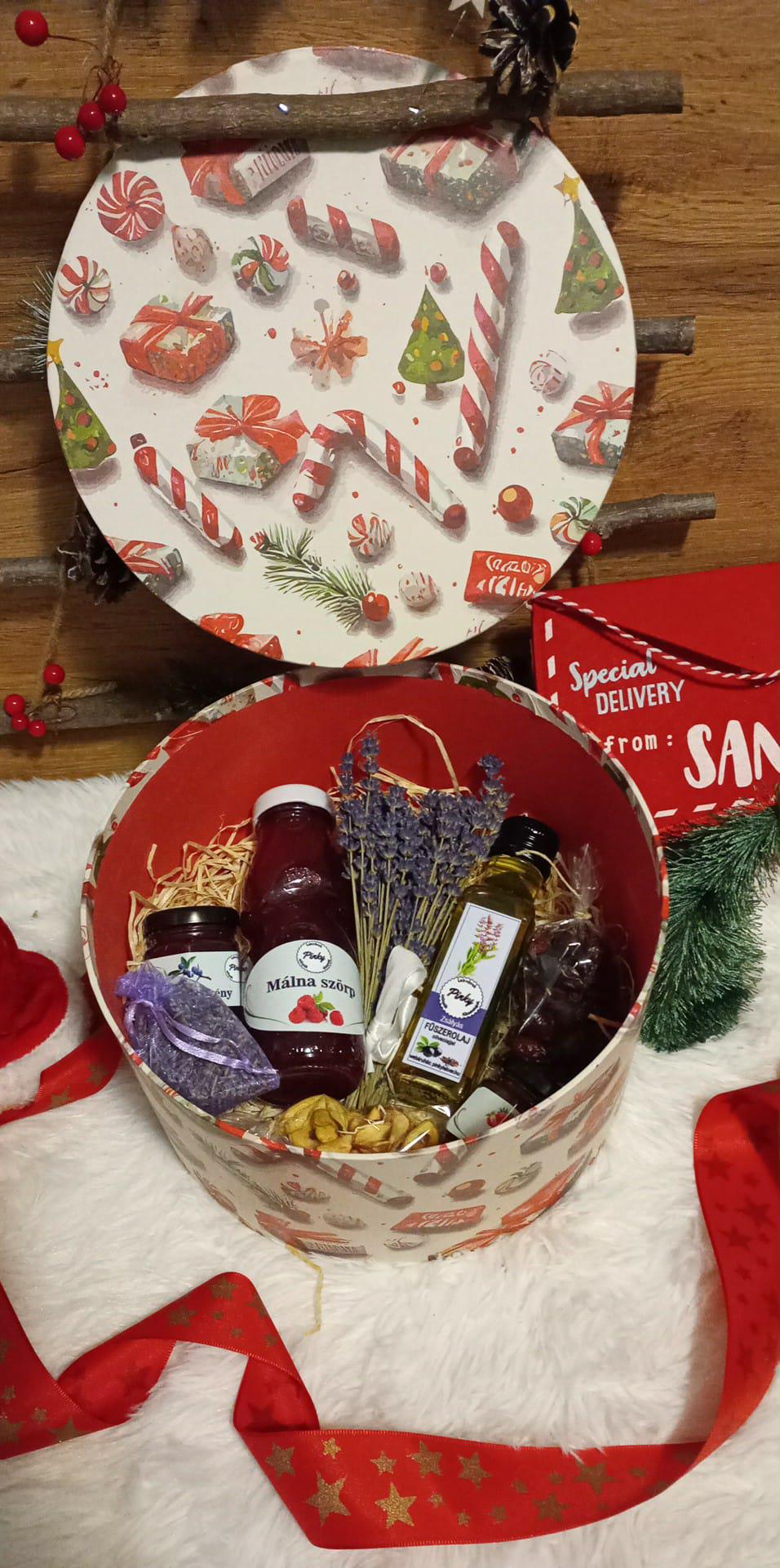 Összetétel: málna szörp, zsályás fűszerolaj extra szűz olivaolajban, kökény lekvár, levendula zsák, eper dzsem, alma chips,levendula csokor, száritott csipkebogyó teának,