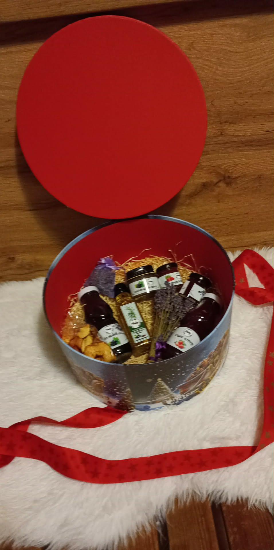 Összetétel:szőlőmag őrlemény, eper szörp, galagonya lekvár, alam chips, levendula csokor, Szakmai Elít dijjas othelló szőlő szörp, rozmaringos fűszerolaj extra szűz olivaolajjal, száritott csipkebogyó teának, kökény lekvár, levendula zsák,