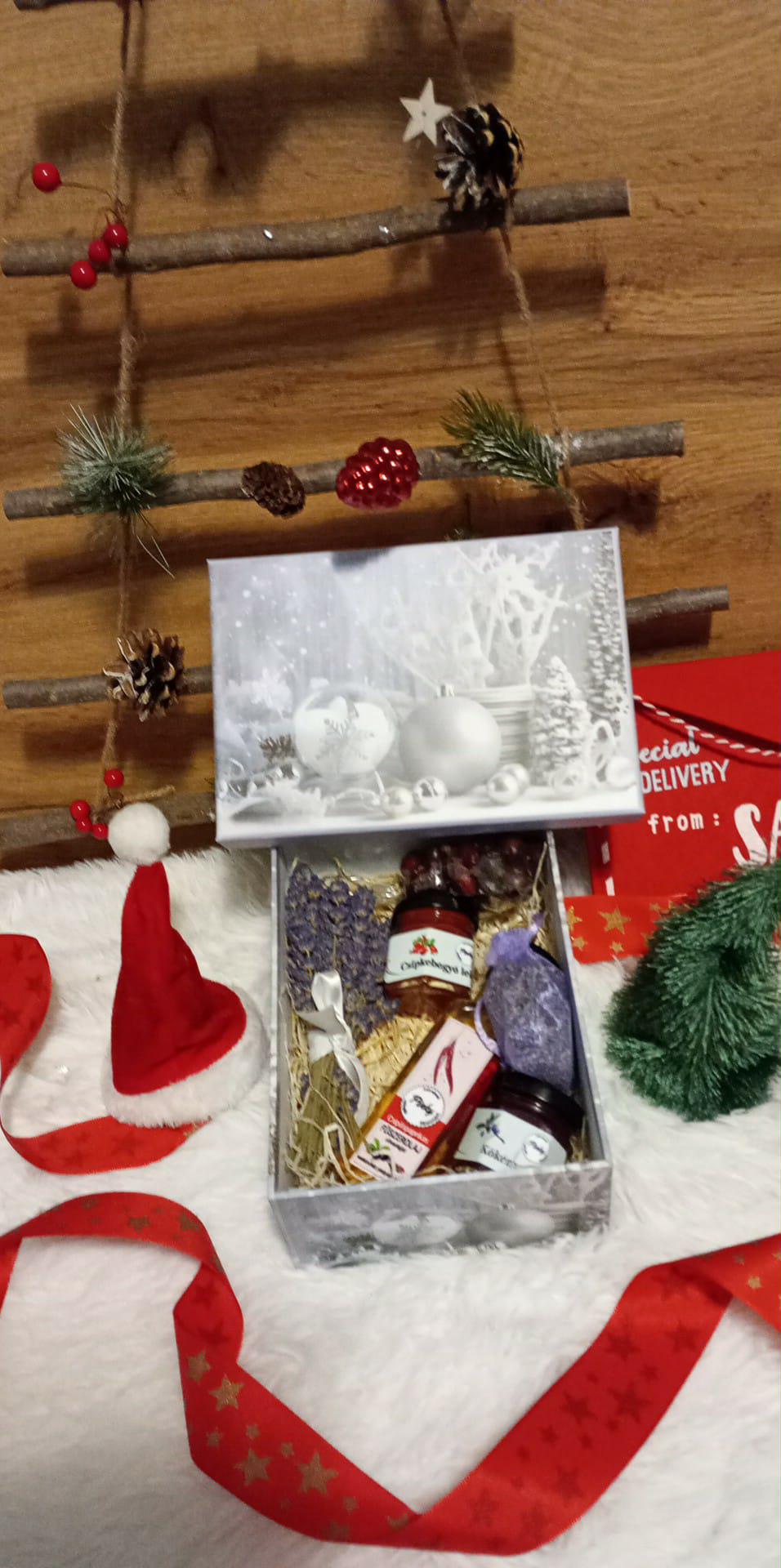 Összaetétel: csipkebogyó lekvár, chilis fűszerolaj extra szűz olivaolajjal, kökény lekvár, levendula zsák, szárított vsipkebogyó teába, levendula csokor,