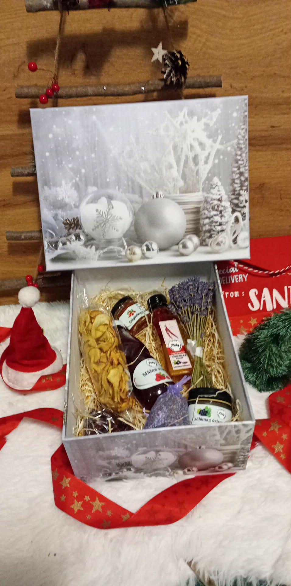 Összetétel: málna szörp, levendula csokor, alma chips, csipkebogyó lekvár, szőlőmag őrlemény, száritott csipkebogy teának, chilis fűszerolaj extra szűz olivaolajjal, levendula csokor,