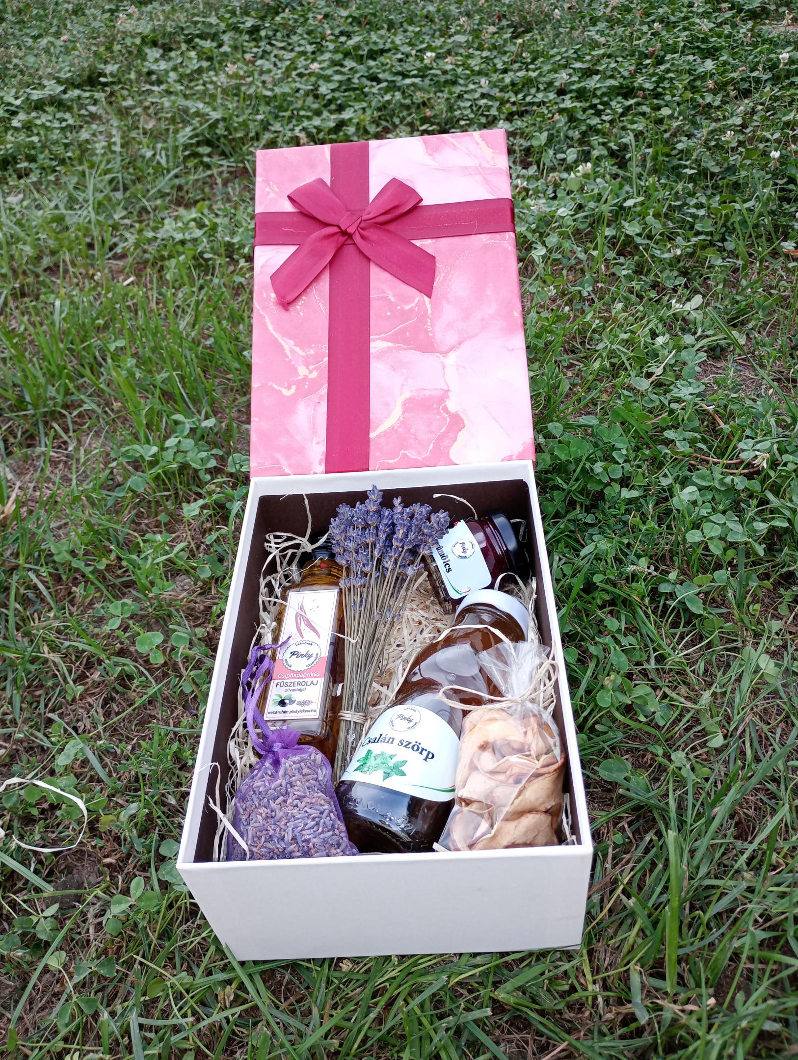 Összetétel: Csalán szörp, chilis fűszerolaj extra szűz olívaolajjal, erdei gyümölcs lekvár, alma chips, levendula zsák, levendula csokor,