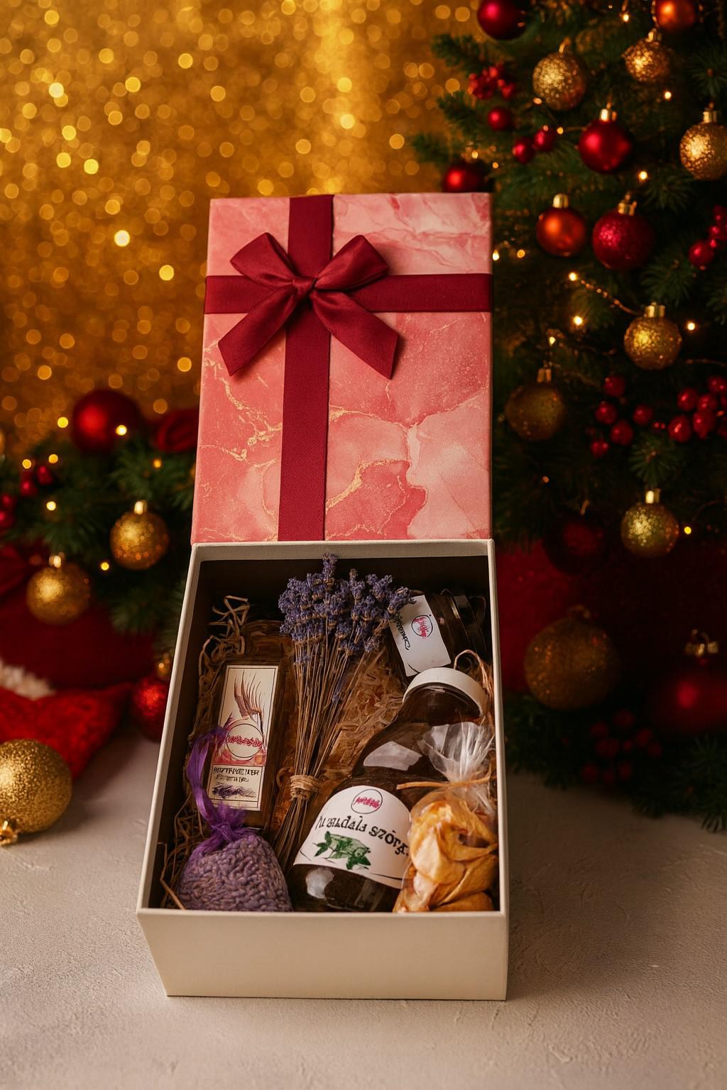 Összetétel: Csalán szörp, chilis fűszerolaj extra szűz olívaolajjal, erdei gyümölcs lekvár, alma chips, levendula zsák, levendula csokor,