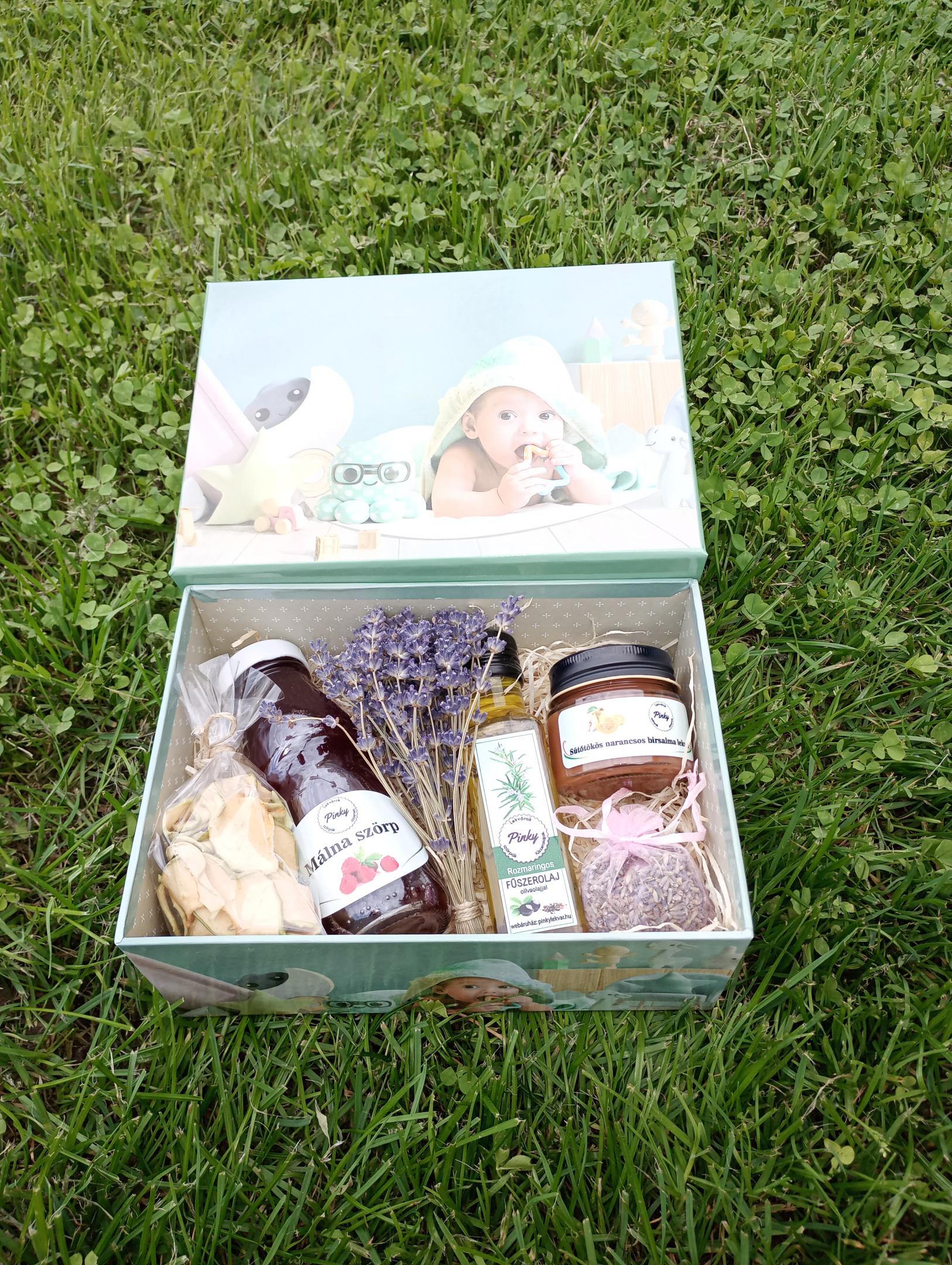 Összetétel: málna szörp, levendula zsák, alma chips, rozmaringos fűszerolaj extra szűz olívaolajjal, sütőtökös narancsos birs lekvár, levendula csokor