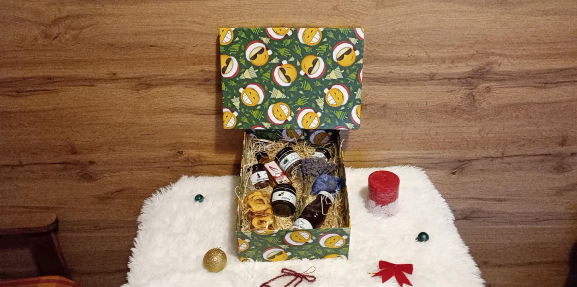 Összetétel: Málna szörp, erdei gyümölcs dzsem, csípőspaprikás fűszerolaj extra szűz olíva olajjal, levendula csokor, alma chips, eper dzsem, levendula zsák, zöld dió lekvár, szőlőmag őrlemény,