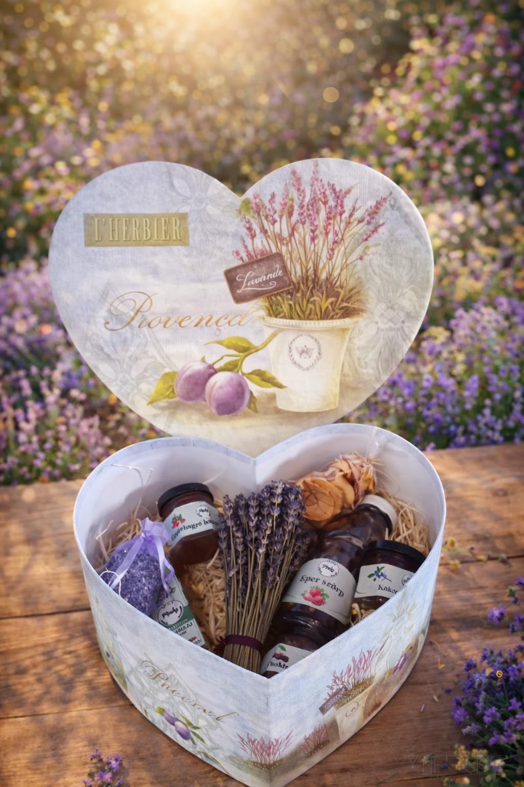 Összetétel: Eper szörp, Kakukkfűves fűszerolaj extra szűz olíva olajjal, csipkebogyó lekvár, csokis meggy dzsem, levendula csokor, alma chips, kökény lekvár, levendula zsák,