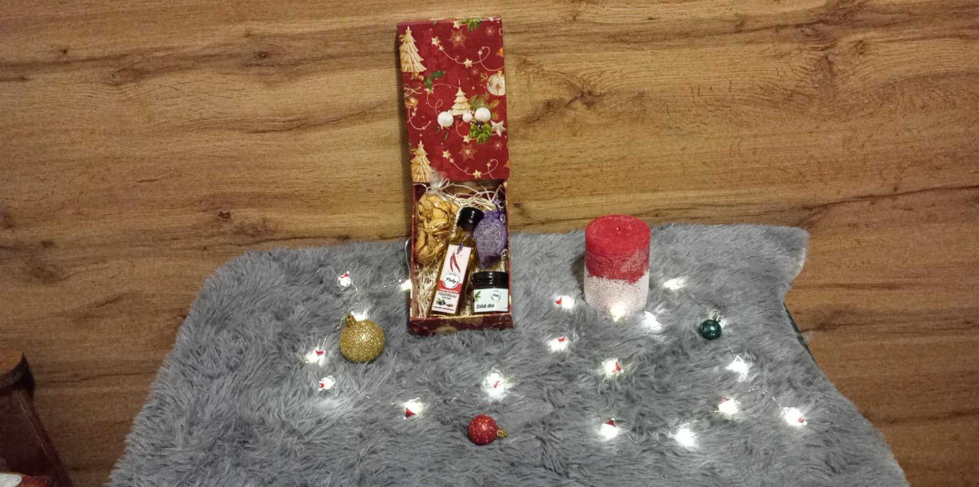 Összetétel: Csípős paprikás fűszerolaj extra szűz olívaolajjal, alma chips, zöld dió lekvár, levendula zsák,