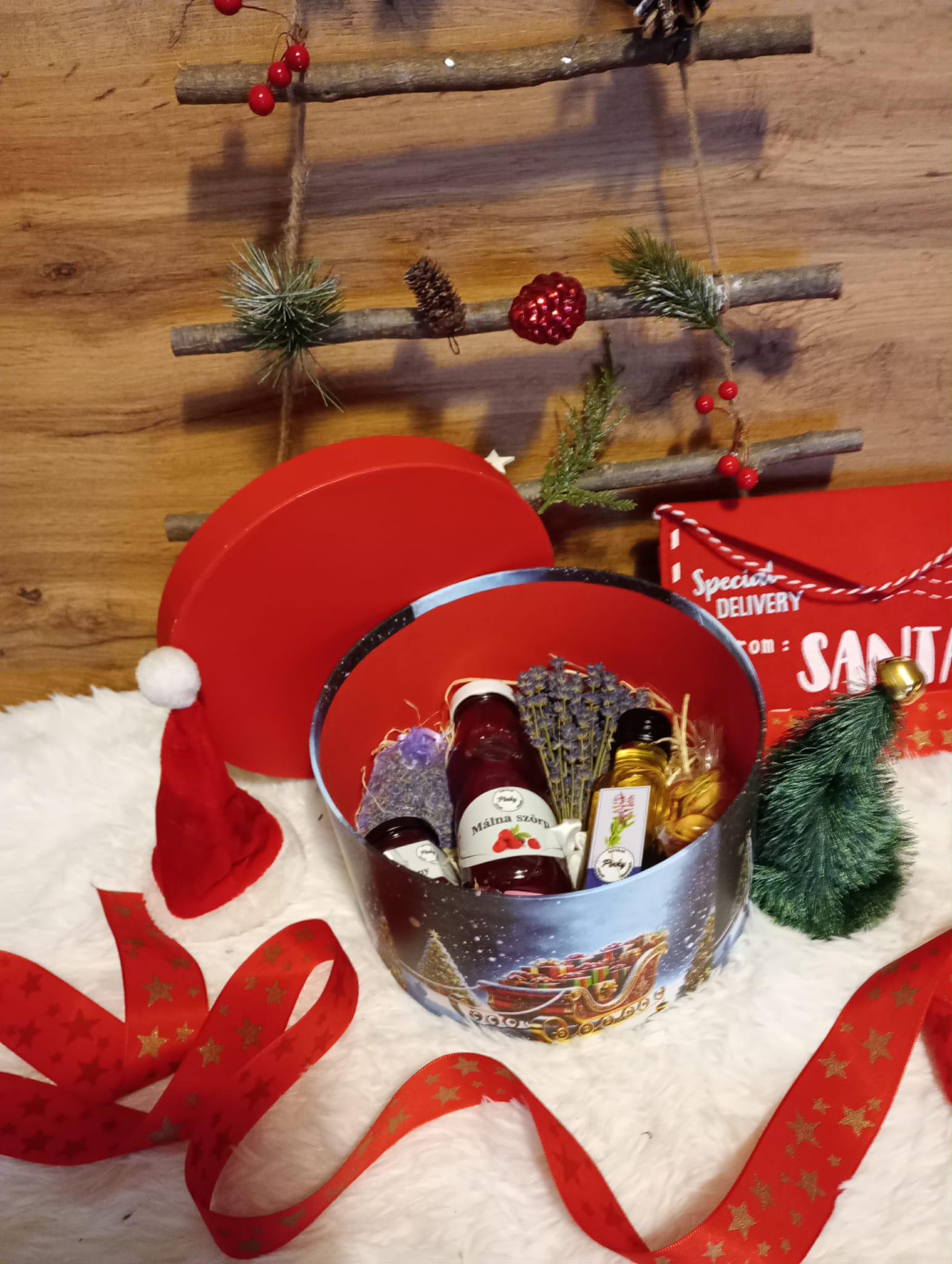 Összetétel: zsályás fűszerolaj extra szűz olívaolajjal, málna szörp, alma chips,levendula csokor, kökény lekvár, levendula zsák, száritott csipkebogyó teának,