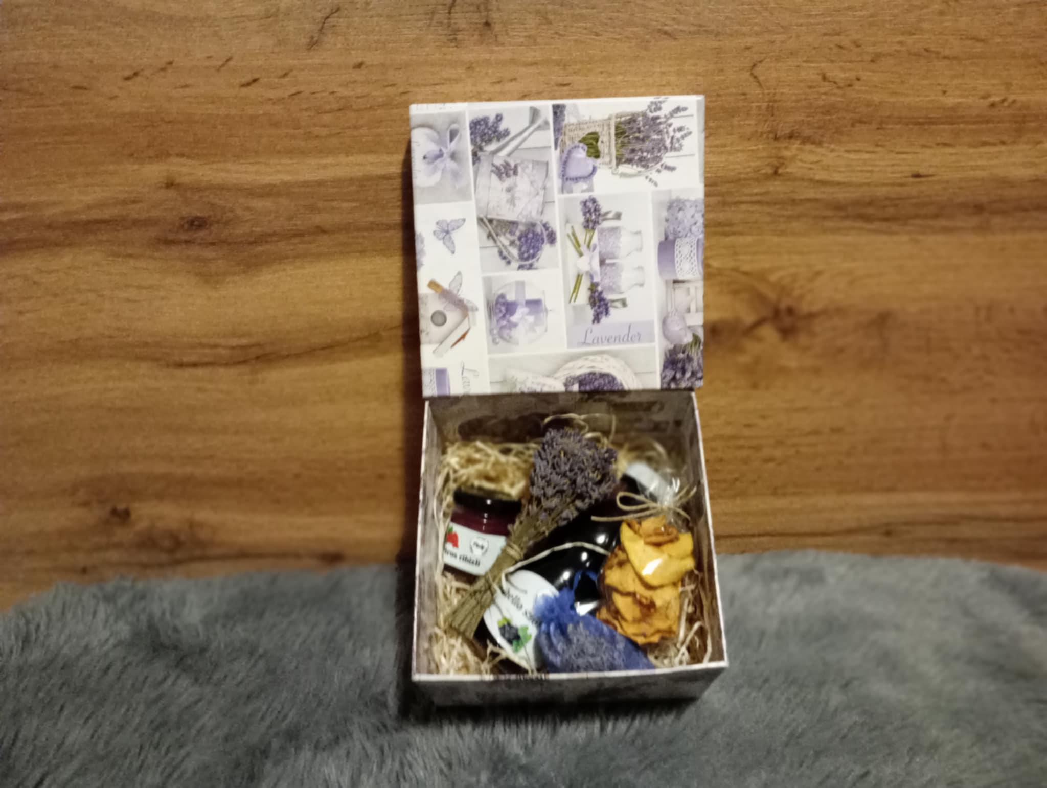 Összetétel: Othello szőlő szörp, piros ribizli dzsem, levendula csokor,alma chips, levendula zsák,