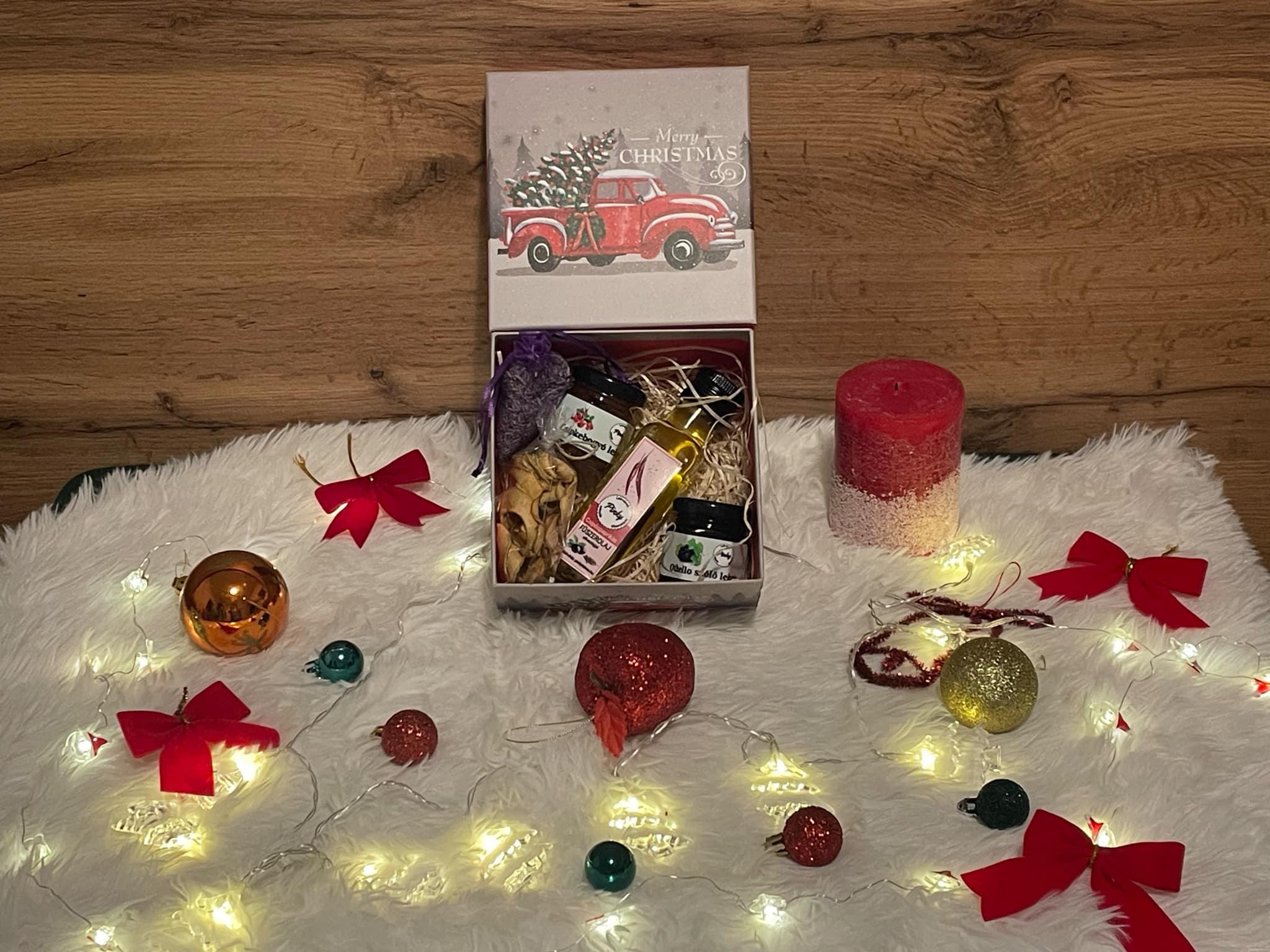 Összetétel: Csípős paprikás fűszerolaj extra szűz olívaolajjal, levendula zsák, csipkebogyó lekvár, alma chips, othello szőlő lekvár,
