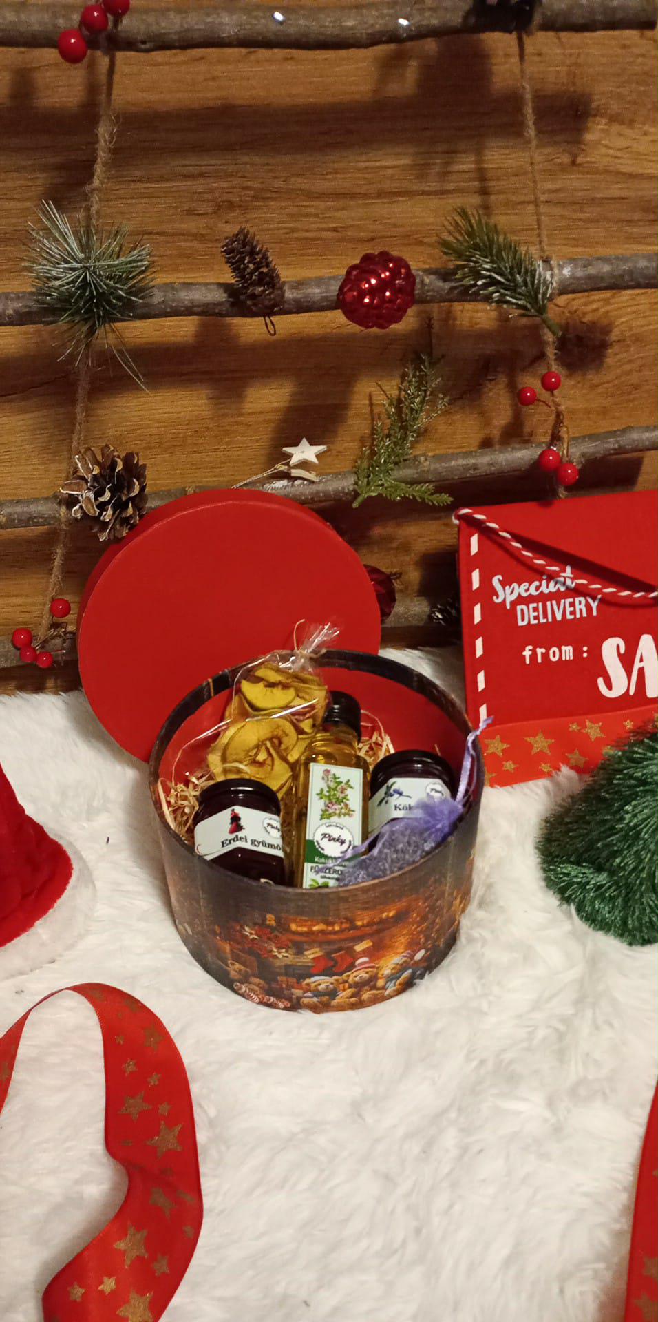 Összetétel: kakukkfűves fűszerolaj extra szűz olívaolajjal, kökény lekvár, alma chips, erdei gyümöcs dzsem, levendula zsák,