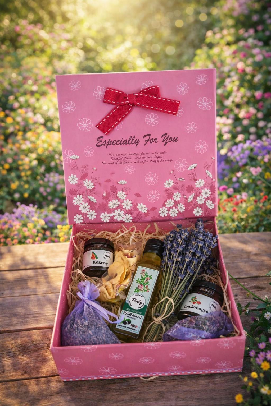 Összetétel: Kakukkfűves fűszerolaj extra szűz olivaolajjal, kökény lekvár,levendula zsák, alama chips, csipkebogyó lekvár, levendula csokor