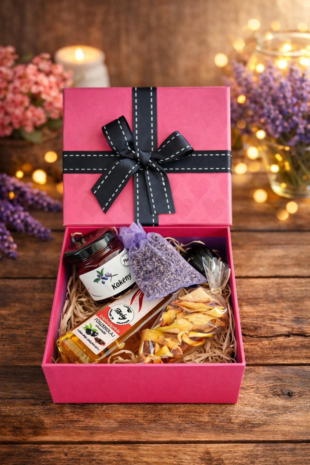 Összetétel: Chili paprikás fűszerolaj extra szűz olivaolajjal, kökény lekvár, alma chips, levendula zsák,