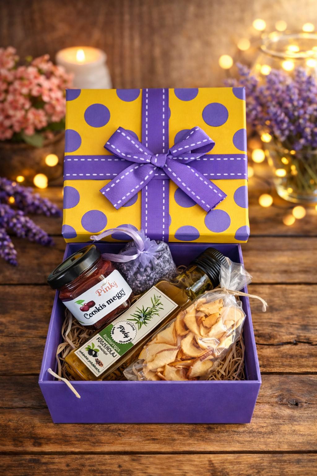 Összetétel: Rozmaringos fűszerolaj extra szűz olívaolajjal, csokis meggy dzsem, alma chips, levendula zsák,