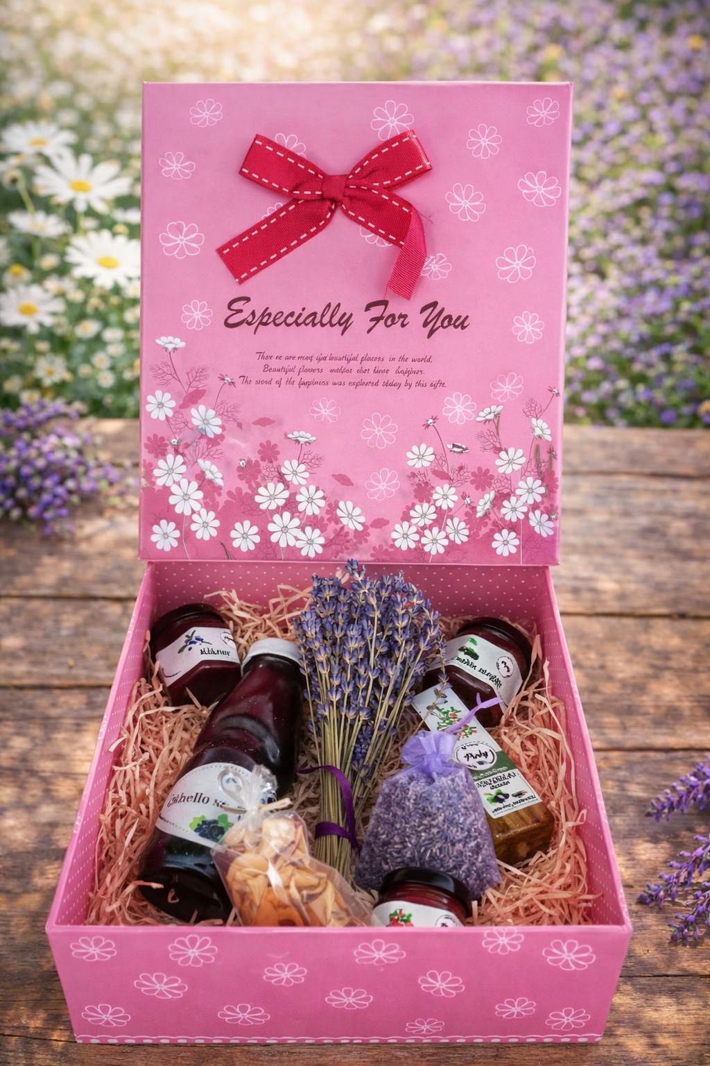 Összetétel: Szakmai elit díjas othelló szőlő szörp, kakukkfűves fűszetolaj extra szűz olivaolajjal, alma chips,csokis meggy dzsem, kökény lekvár, levendula zsák, csipkebogyó lekvár, levendula csokor