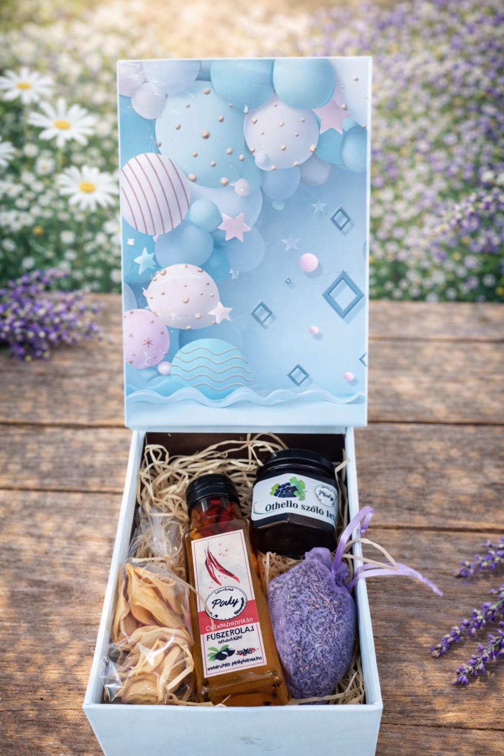 Összetétel: Chilis fűszerolaj extra szűz olívaolajjal, othelló lekvár, alma chips, levendula zsák