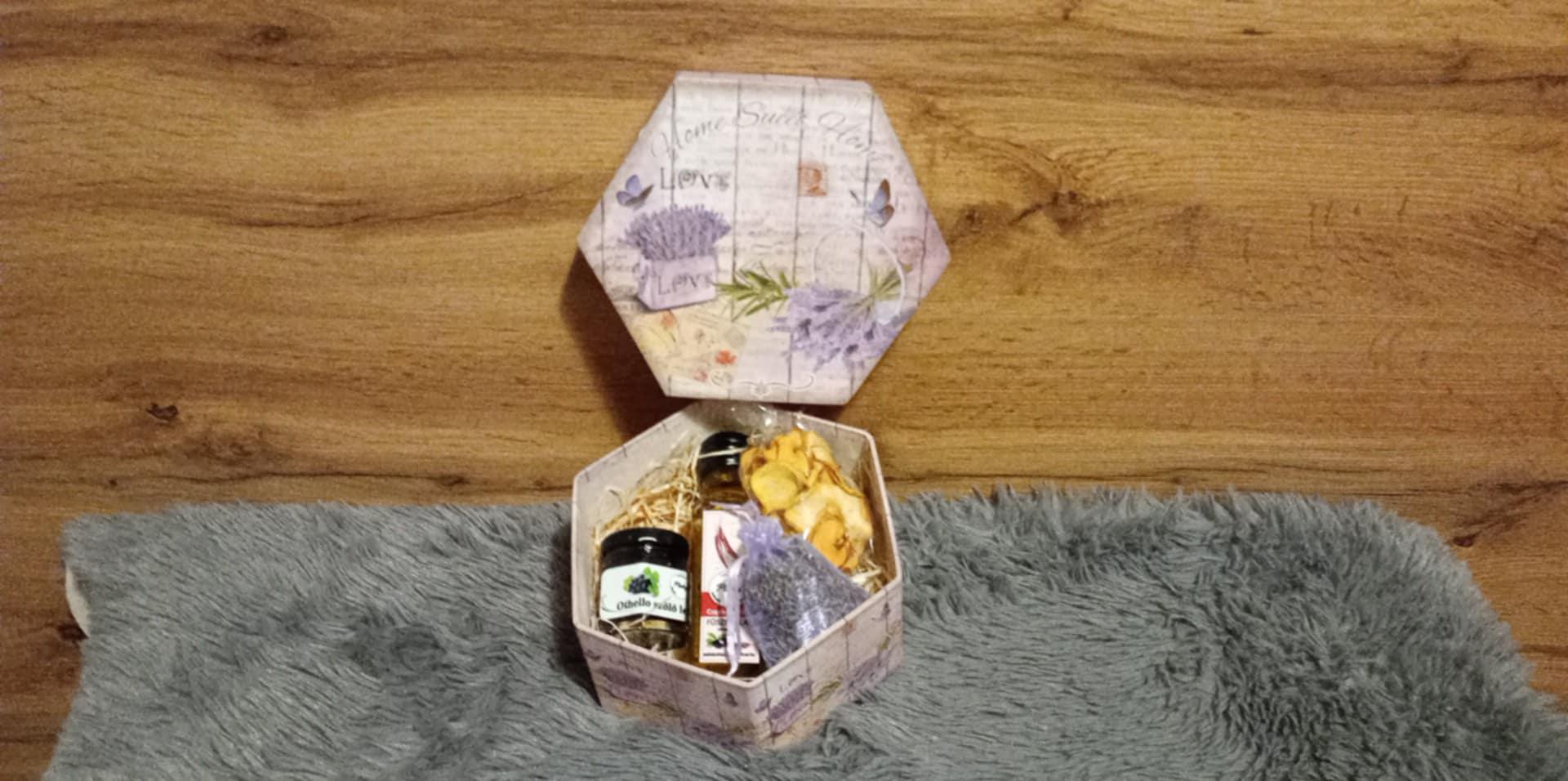 Összetétel: Csípős paprikás füszerolaj extra szűz olivaolajjal, levendula zsák, alma chips, othello lekvár,
