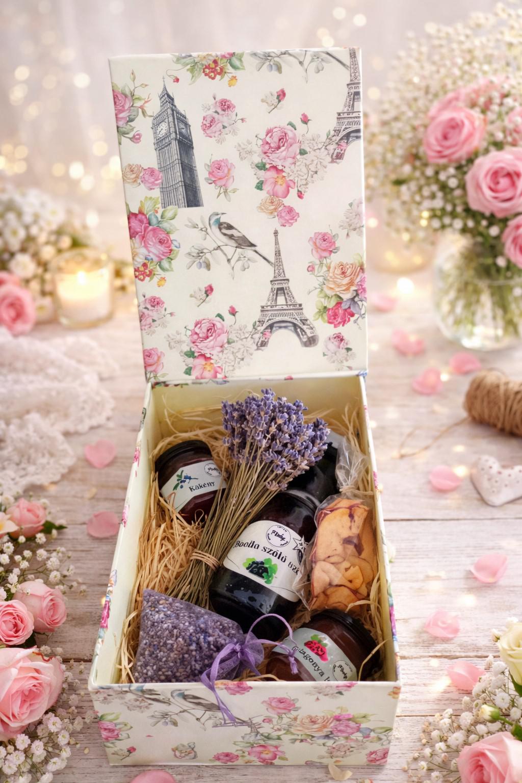 Öszetétel: Szakma elít dijas othelló szőlő szörp, galagonya lekvár, levendula csokor, alma chips, levendula zsák, kökény lekvár,