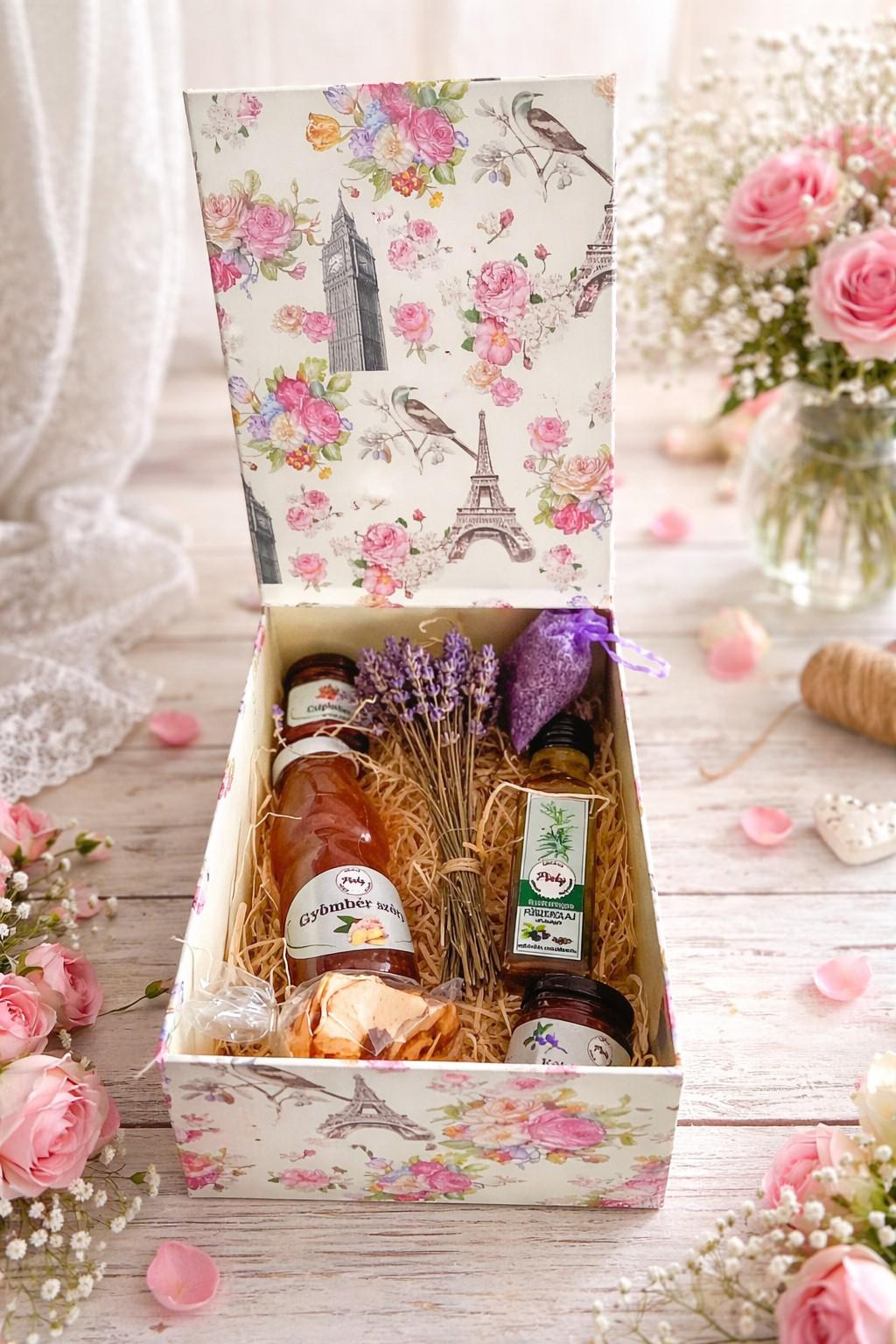 Összetétel: Gyömbér szörp, csipkebogyó lekvár, alma chips, levendula zsák, rozmaringos fűszerolaj extra szűz olivaolajjal, levendula csokor, kökény lekvár