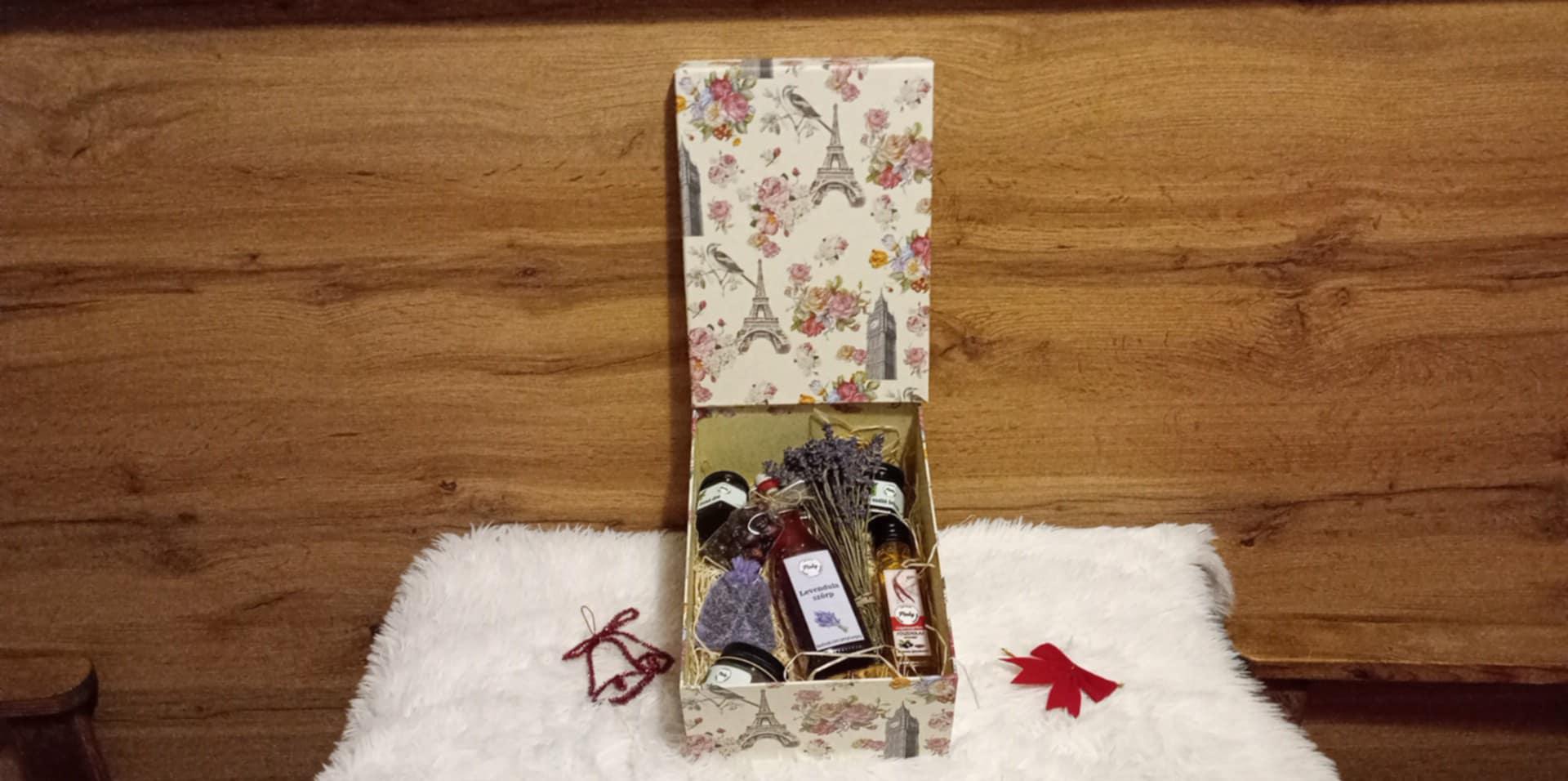 Összetétel: Levendula szörp csatos üvegben, levendula zsák, szárított csipkebogyó teának, alma chips, csípőspaprikás fűszerolaj extra szűz olivaolajjal, zöld dió lekvár, levendula csokor, szőlőmag őrlemény, othello szőlő lekvár