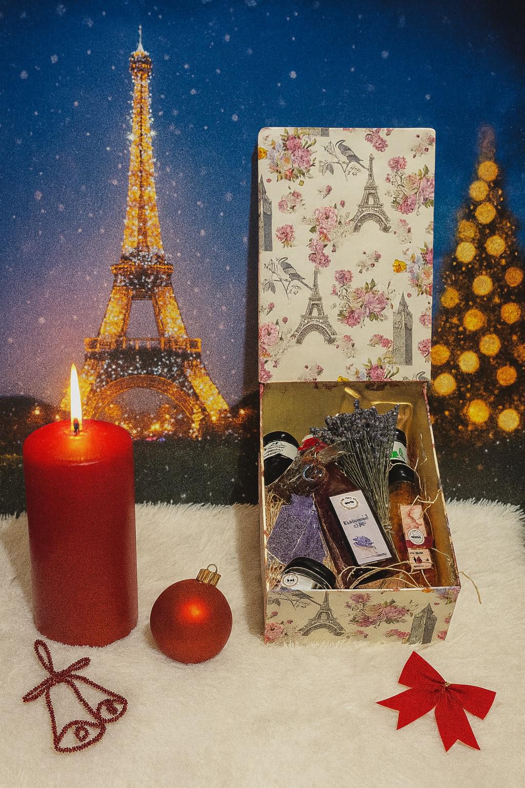 Összetétel: Levendula szörp csatos üvegben, levendula zsák, szárított csipkebogyó teának, alma chips, csípőspaprikás fűszerolaj extra szűz olivaolajjal, zöld dió lekvár, levendula csokor, szőlőmag őrlemény, kökény lekvár,
