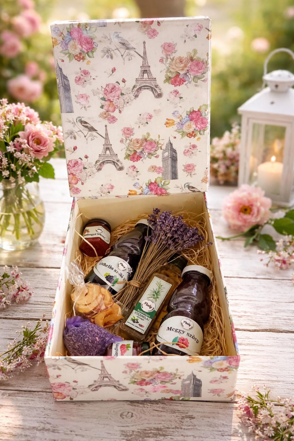 Összetétel: Szakmai elit díjas othelló szőlő szörp, levendula zsák, alma chips, rozmaringos fűszerolaj extra szűz olivaolajjal, galagonya lekvár, levendula csokor, csipkebogyó lekvár, meggy szörp